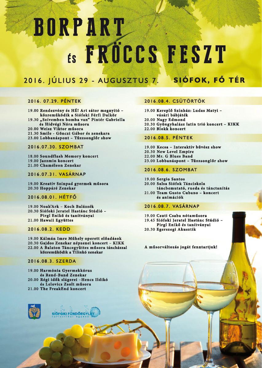 Negyedik alkalommal kerül megrendezésre a Borpart és Fröccs Feszt rendezvény Siófokon. Helyi zenekarok, kellemes borok, gasztronómiai ételkülönlegességek, gyermekprogramok és az esti órákban koncertek a 10 napos rendezvénysorozaton.